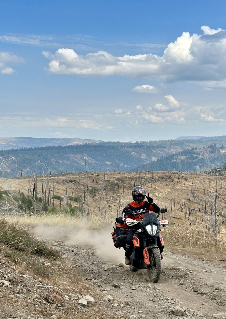 Leaving Chester, the ride turned raw. Dirt two-tracks and rocky trails cut deep into the backcountry, where blackened trunks from the 2021 Dixie Fire stood like silent witnesses. The land was scarred but recovering—ferns sprouting, pines reaching back toward the sky. Navigating primitive paths through steep forest climbs demanded focus and grit. Fatigue crept in, but so did a sense of resilience. We were learning that adventure isn’t just about moving forward—it’s about honoring what the land has endured and how we, too, keep going despite hardship.